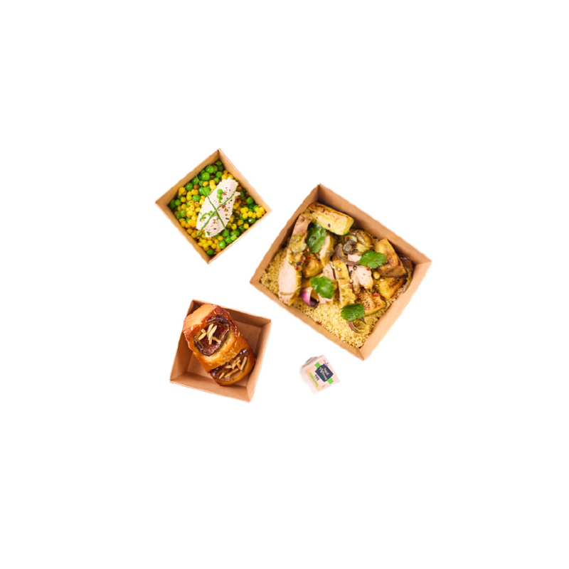 Tagine de poulet, abricots et amandes, semoule, aubergine et courgette