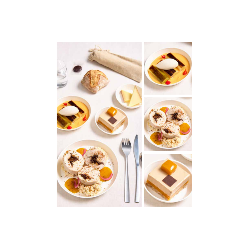 ENTRÉE Poireau rôti, quenelle de chèvre, coulis de patate douce au gingembre
