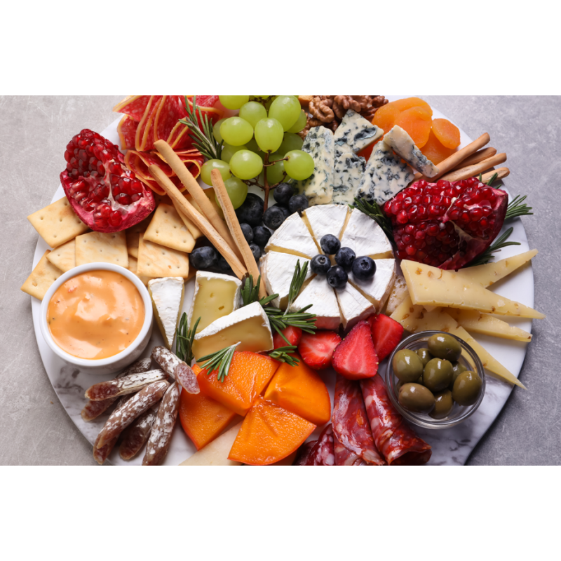 Jambon aux herbes, Coppa, Spianata, chèvre frais au curry, Comté, Gouda au cumin, crackers, carottes jaunes, radis noirs, tomates cerises jaunes, abricots secs, houmous au curcuma, fleurs comestibles
